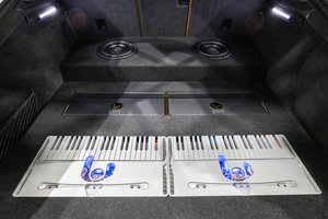 Aピラーには、GroundZeroのトゥイーターとミッドが装着されているのが見えるが、実はドアの純正位置、Burmesterのグリルの中にアキュトンのユニットを新たに追加(裏側に入っているため見えないが、価格的にはこちらが上)。このアキュトンを鳴らすために、専用アンプとしてFantasiaを導入した、という経緯とのこと。