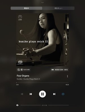 QRONOの効果を確認するために、リンレコーズから発売されている加藤訓子作品をチェック。Qobuzで配信されているのも嬉しい。『KUNIKO PLAYS REICH 2』から、1曲目の「フォー・オルガンズ(4台のオルガン)」を聴くと、マラカスの規則正しい刻み、楽器の中の粒の動きまでリアルに見えるよう。打楽器の立ち上がりはオーディオ的に難度の高い再生であるが、過不足ない情報量を引き出していることがよく理解できた。QRONOのオンオフができないのは残念だが、新しいDAコンバーターの可能性として期待できそうだ。