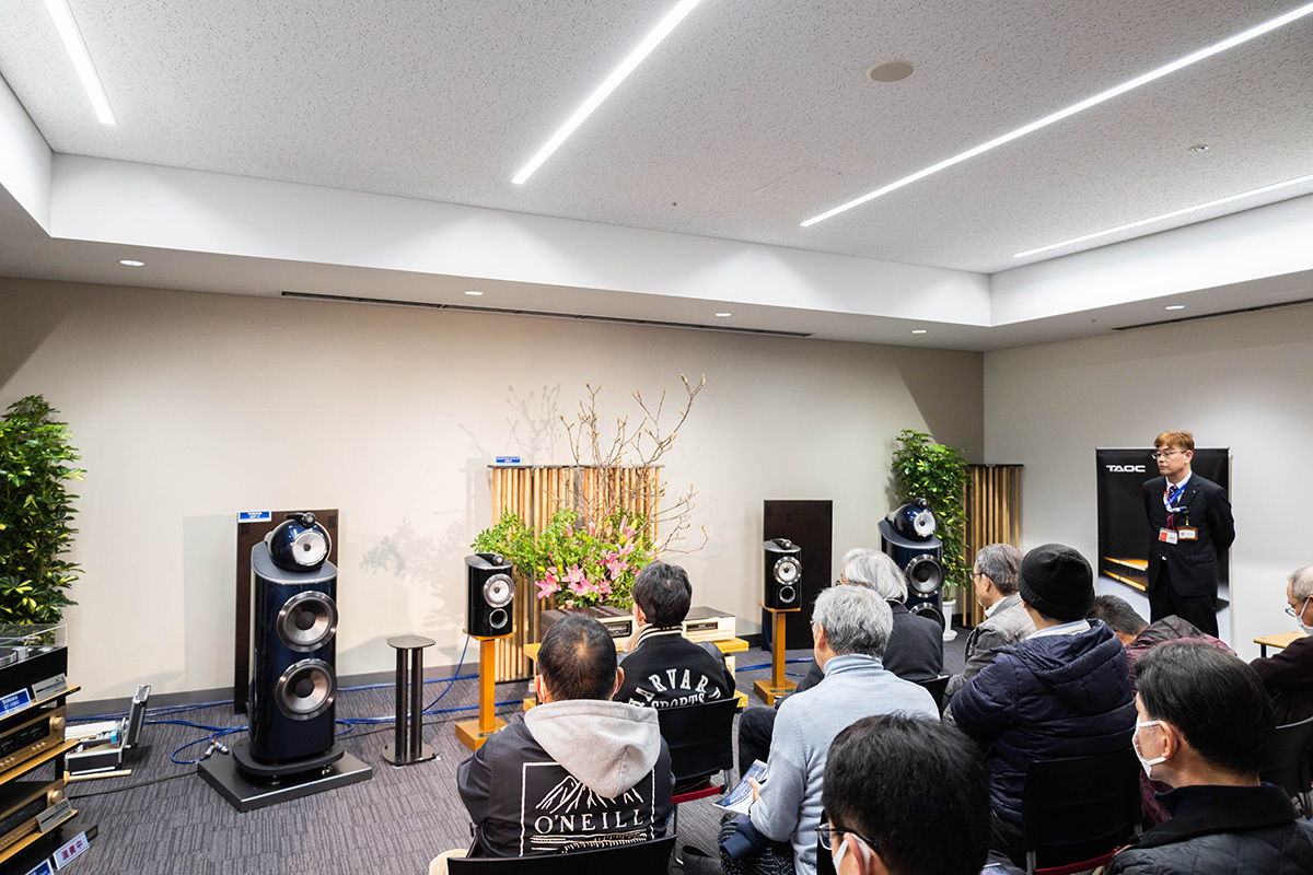 同じ部屋では、ラックやインシュレーター、スタンド等を展開するアイシン高丘のオーディオブランド、TAOCもデモンストレーションを実施。同社のCSRラックシリーズの頑丈な作りの解説に加え、B&Wの「805シリーズ」の実力をさらに引き出す専用スピーカースタンドの比較試聴を行っていた。