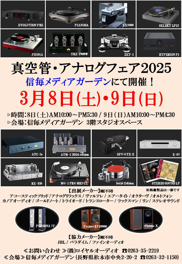 長野県松本市のオーディオショップ、ロイヤルオーディオは、3月8日(土)と9日(日)の2日間、「真空管・アナログフェア2025」を開催する。場所は信毎メディアガーデン3Fのスタジオスペース。参加は無料。