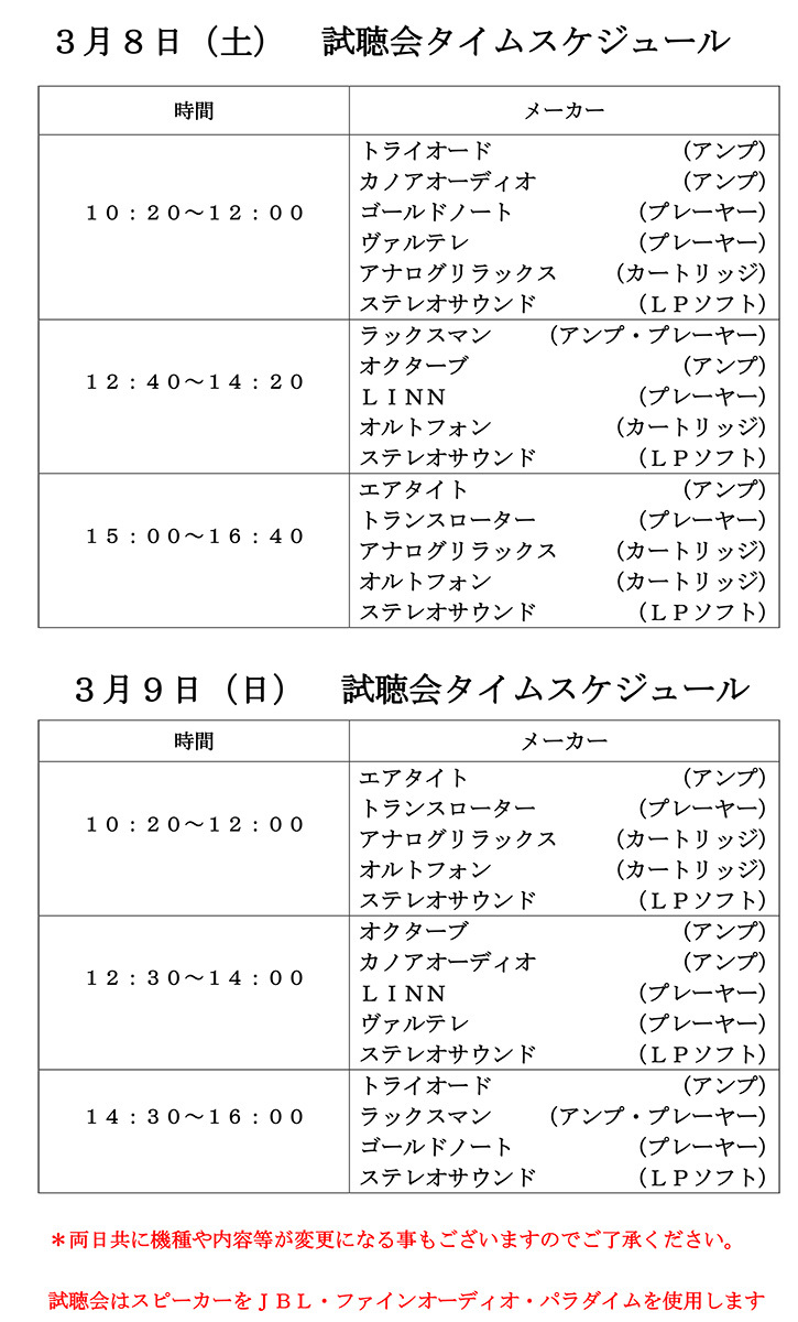 アナログプレーヤーには、ラックスマンのほかリン、ゴールドノートなどいま注目のブランドが勢揃い。スピーカーには、JBLの「Project K2 S9900」、パラダイムの「PERSONA 7F」、Fyne Audioの「Classic X」を組み合わせ。時間帯ごとに区切って、3通りのシステムプランによるの試聴会が開催される。