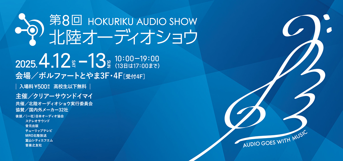 クリアーサウンドイマイが主催する「第8回北陸オーディオショウ」が、4月12日(土)と13日(日)の2日間、富山県の「ボルファートとやま」にて開催される。入場料は500円、高校生以下は無料となる。