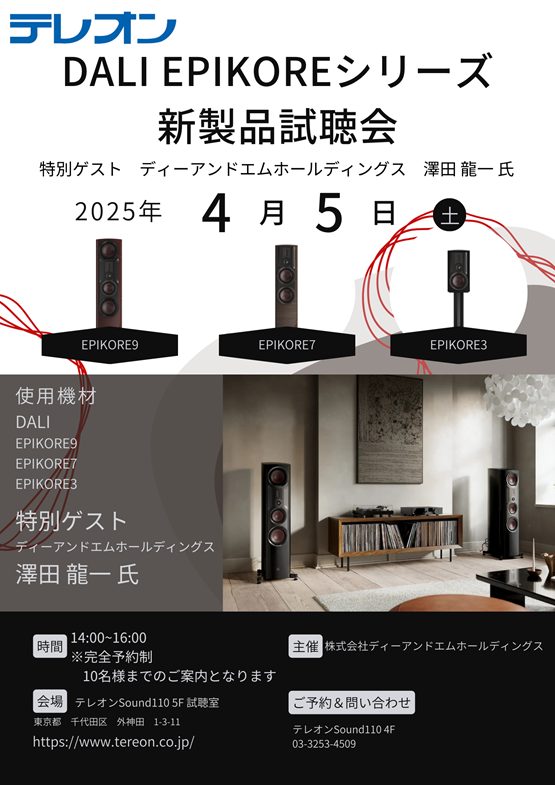 秋葉原のオーディオ専門店テレオンは、3月下旬に発売されるデンマークDALI “EPIKOREシリーズ” の新製品スピーカー3モデルを取り上げた試聴イベント、「DALI EPIKOREシリーズ新製品試聴会」を、2025年4月5日(土)にテレオンsound 110(第2店)5階試聴室にて開催する。