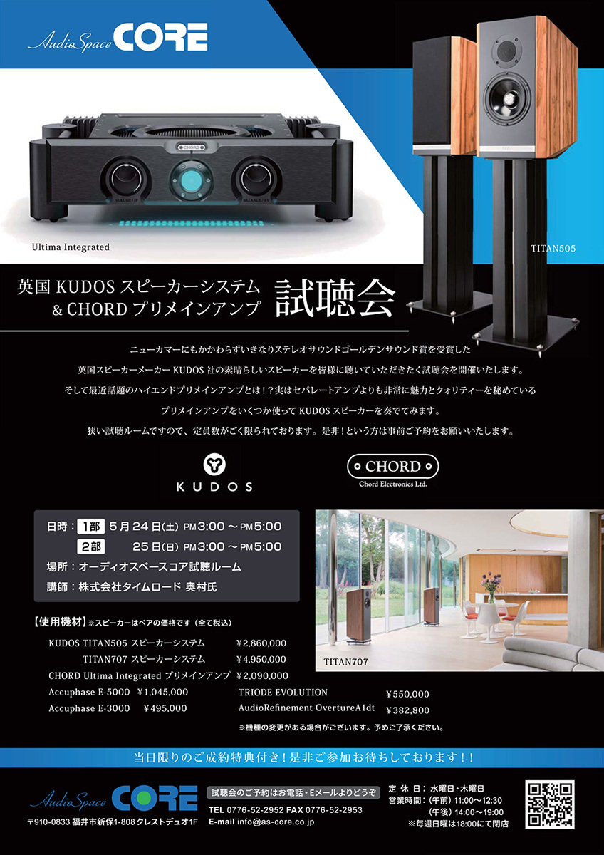 タイムロードが輸入するイギリスKUDOS(キュードス)ブランドの試聴会が、5月24日(土)と25日(日)の2日間、福井県のオーディオショップ、オーディオスペースコアにて開催される。
