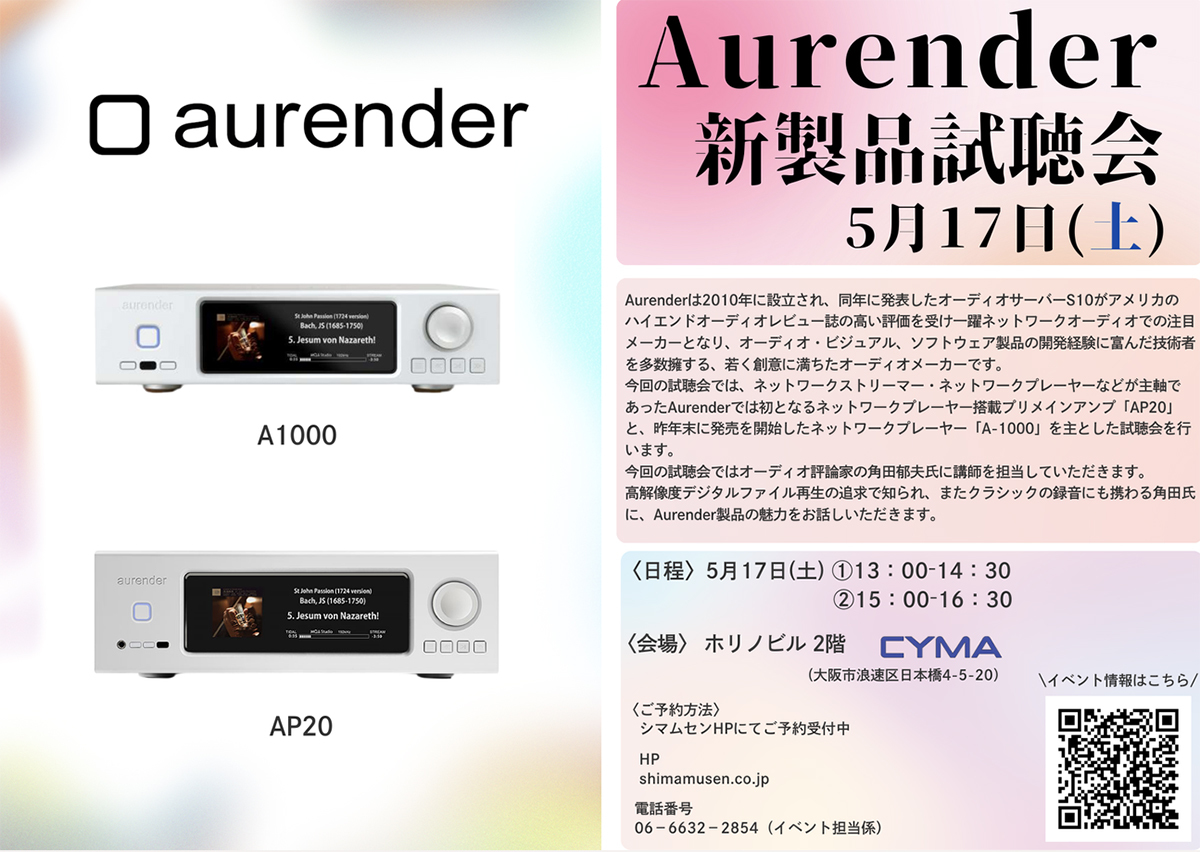 大阪・日本橋のオーディオ専門店 シマムセンは、5月17日(土)にAurenderのネットワークプレーヤーの試聴会を開催する。場所はシマムセン別館2FのCYMA Event Room、講師は角田郁雄氏が担当する。