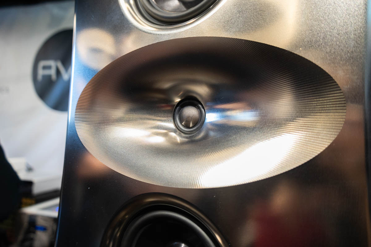 YGアコースティクスの過去モデルのデザインを踏襲した、優美な曲線を多用した金属キャビネット。仕上げも鏡のように磨き上げられている。高さはなんと2.5m、5ウェイ8スピーカーとなる堂々たる威容である。中央のトゥイーターを挟んで上下対称のデザインに、最下部にはウーファーが設けられている。デザイン面ではトゥイーターのまわりのウェーブガイドに細い線が刻まれているのが美しい。