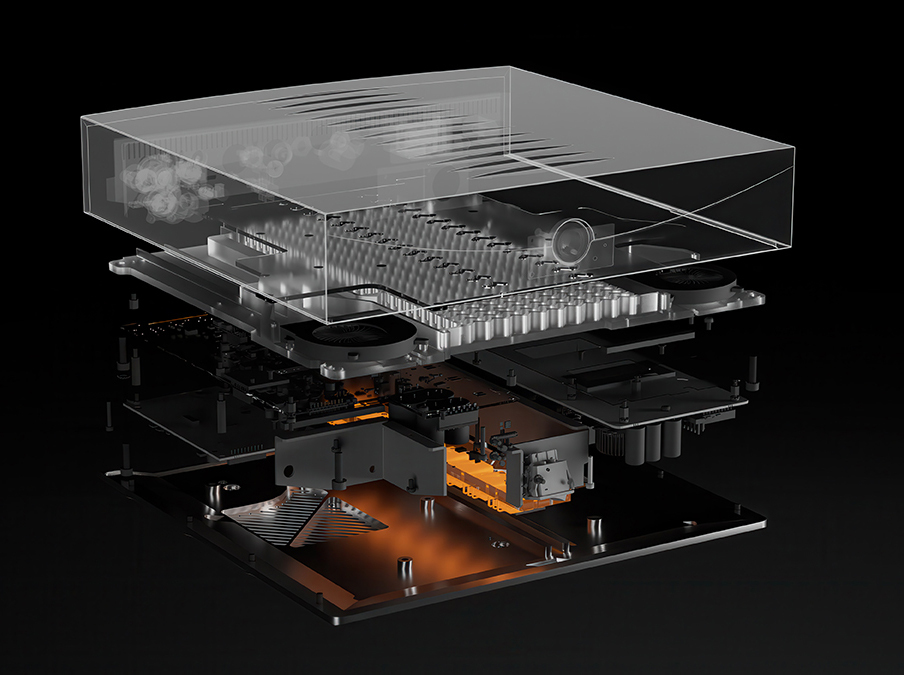 このファンのリアルタイム制御にもFPGAプロセッサが用いられており、内部温度や入力音声信号を計測、必要最小限の回転数でファンを回転させ、極静音で動作しながら加熱を防止するとしている。