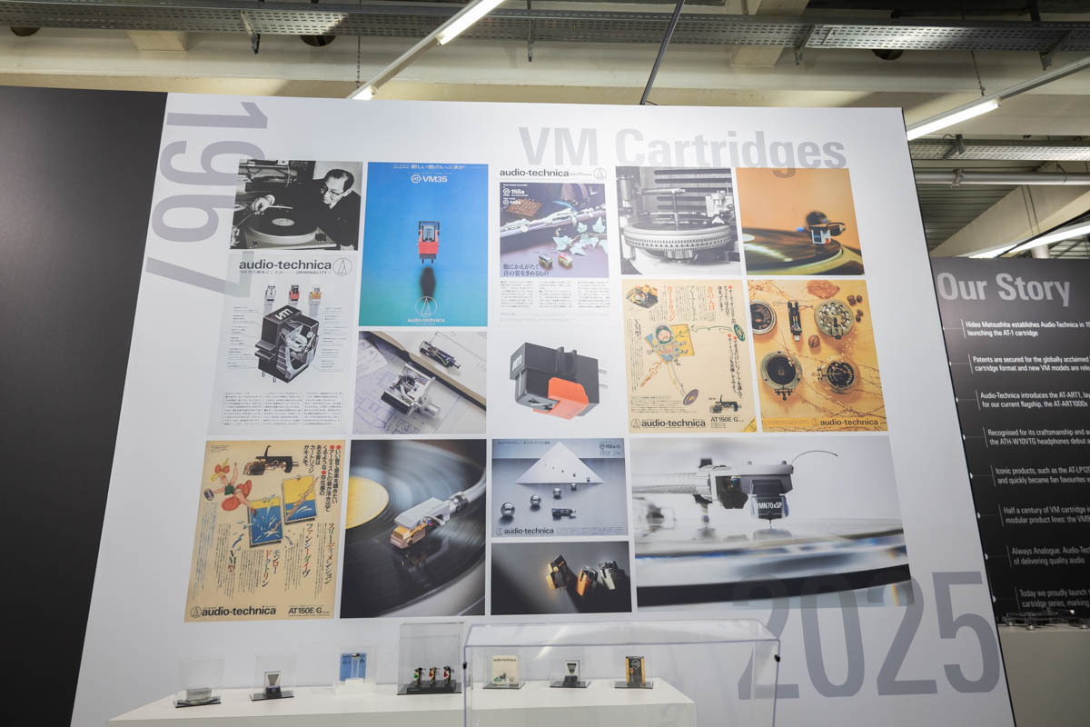 今回はオーディオテクニカの「歴史」にこだわった展示としたそうで、同社の沿革やエポックメイキングな製品をまとめた年表や、日本の雑誌に掲載された昔の広告などを大きくブース壁面に張り出し、60年以上にも渡る製品開発の蓄積をアピール。