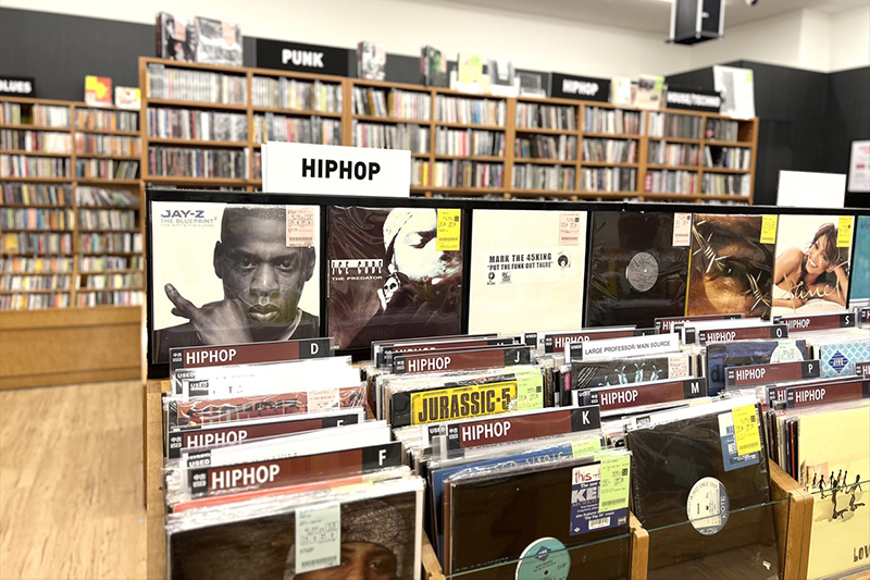 CD/DVDは総展示数24,000点。定番作品からコレクターズアイテムまでジャンルごとにわかりやすく陳列され、掘り出し物探しにも最適としている。メタルとヒップホップ各専門スタッフによる推し作品の展開や、映画DVD・音楽DVDも取り扱う。