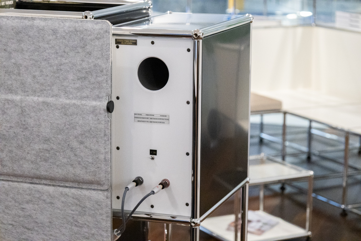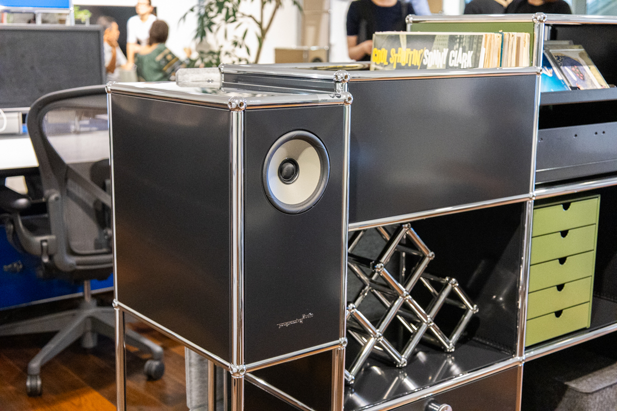 今回は、スイスのモジュラー家具ブランドであるUSMハラーとコラボし、USMハラーのポールジョイントなどを活用した特別コラボレーションスピーカーが誕生。丸の内にある「USM東京ショールーム」にて、スピーカーのお披露目会が開催された。