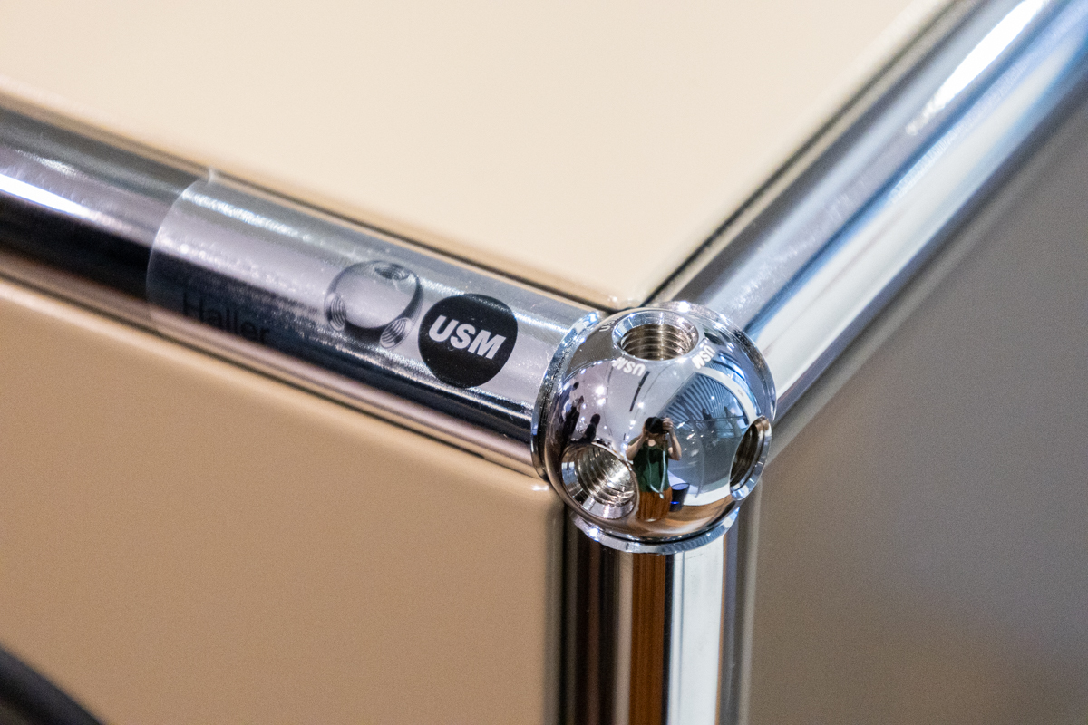 キャビネットのエッジ部分に、USMハラーの象徴でもあるスチールチューブとボールジョイントを配置。USMハラーのシェルフやデスクなどと共通したデザインで、スタイリッシュですっきりとしたインテリアを演出できる。スピーカーのカラーは、USMハラーの家具と同じ14色から選択可能で、インテリアと合わせたコーディネートが可能となっている。