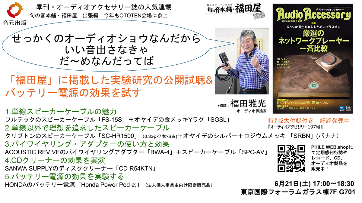 日本オーディオ協会が主催する、オーディオ総合イベント「OTOTEN2025」が、今週末の6月21日(土)と22日(日)の2日間にわたって開催されます。小社・音元出版は、出版社セミナーとして『季刊・オーディオアクセサリー』の人気連載「旬の音本舗・福田屋 出張編 “せっかくのオーディオショウなんだから いい音出さなきゃだ〜めなんだってば”」をご用意。6月21日(土)の17時から、会場はガラス棟 7FのG701となります。
