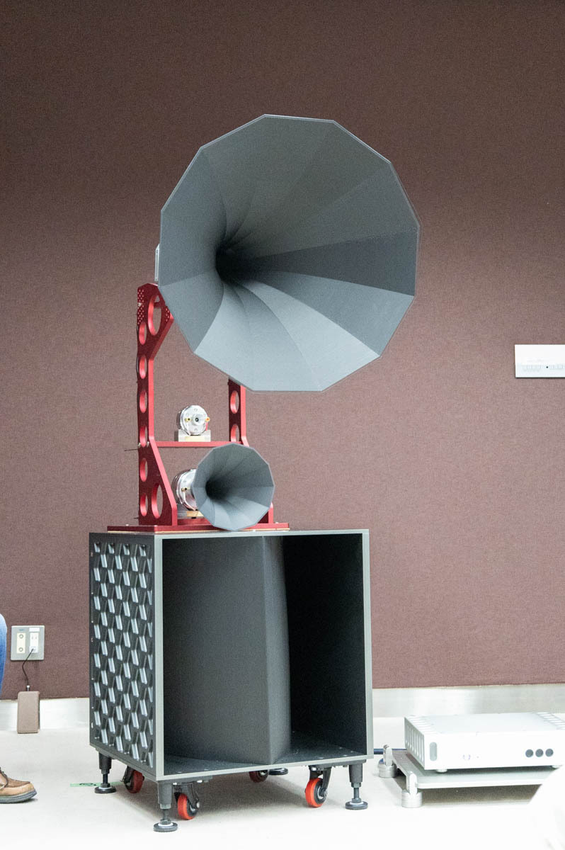 「MRIにも匹敵する」という強力な磁束密度を持つマグネットを活用、大型のホーン部分はカーボン系素材による3Dプリンターで作成されているそうで、最新の技術をいかに活用しながら、ホーンスピーカーの旨味を引き出すかにこだわって開発されているそうだ。
