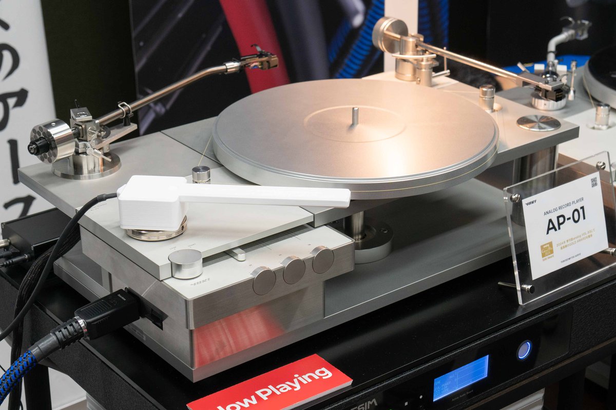 由紀精密は、ターンテーブルシートを使用せずにアナログレコードを直接乗せて再生する導電性プラッターの採用に加え、永久磁石による非接触軸受を使用するマグネットベアリング、ヒステリシスブレーキを採用する専用トーンアームなどで構築されているアナログプレーヤー「AP-01EM」を用いたデモを実施していた。