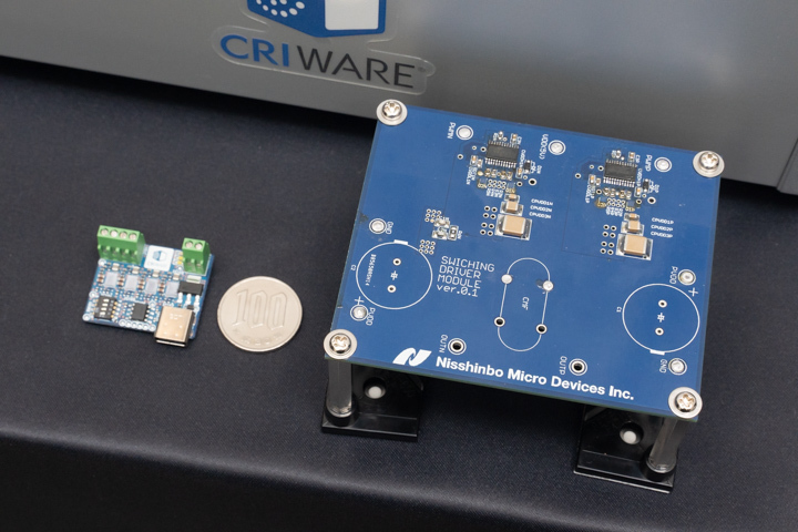 CRI・ミドルウェアは、同社のソフトウェア技術を活かしたオーディオ関連製品や開発ツールをデモンストレーションした。同社のフルデジタルアンプ技術の「CRI D-Amp Driver」は、高効率/省電力/低発熱のGaN(窒化ガリウム)半導体と組み合わせたアンプデバイスとしてサンプルを展示。500円玉大の基板で20W、ふたまわりほど大きな基板で100Wもの出力が可能だといい、コンパクトかつ省電力にも関わらずブックシェルフスピーカーを充分な音量で駆動できることを実演していた。