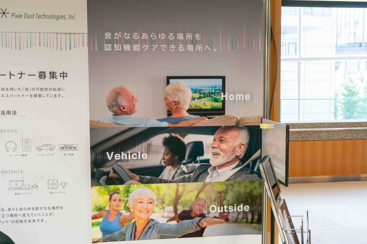 ブースでは技術説明だけでなく、実際に「ガンマ波サウンド」をオンにした音を聴ける視聴体験も実施。パートナー企業としてNTTドコモ、学研ココファン、SOMPOひまわり生命保険、三井不動産などが参加していると明かす。