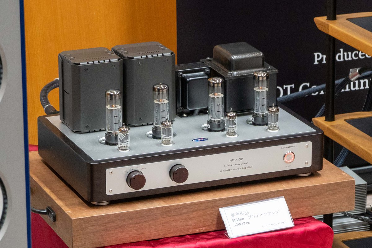 Aurorasoundは、大型の真空管「EL34」が4本、プリ真空管「12AU7 ECC82」と「12AX7 ECC83」が採用されたステレオプリメインアンプ「HFSA-02」(仮)を参考展示。出力32W+32WのEL34ppプリメインアンプとしており、リリースは8月頃、価格は未定だという。