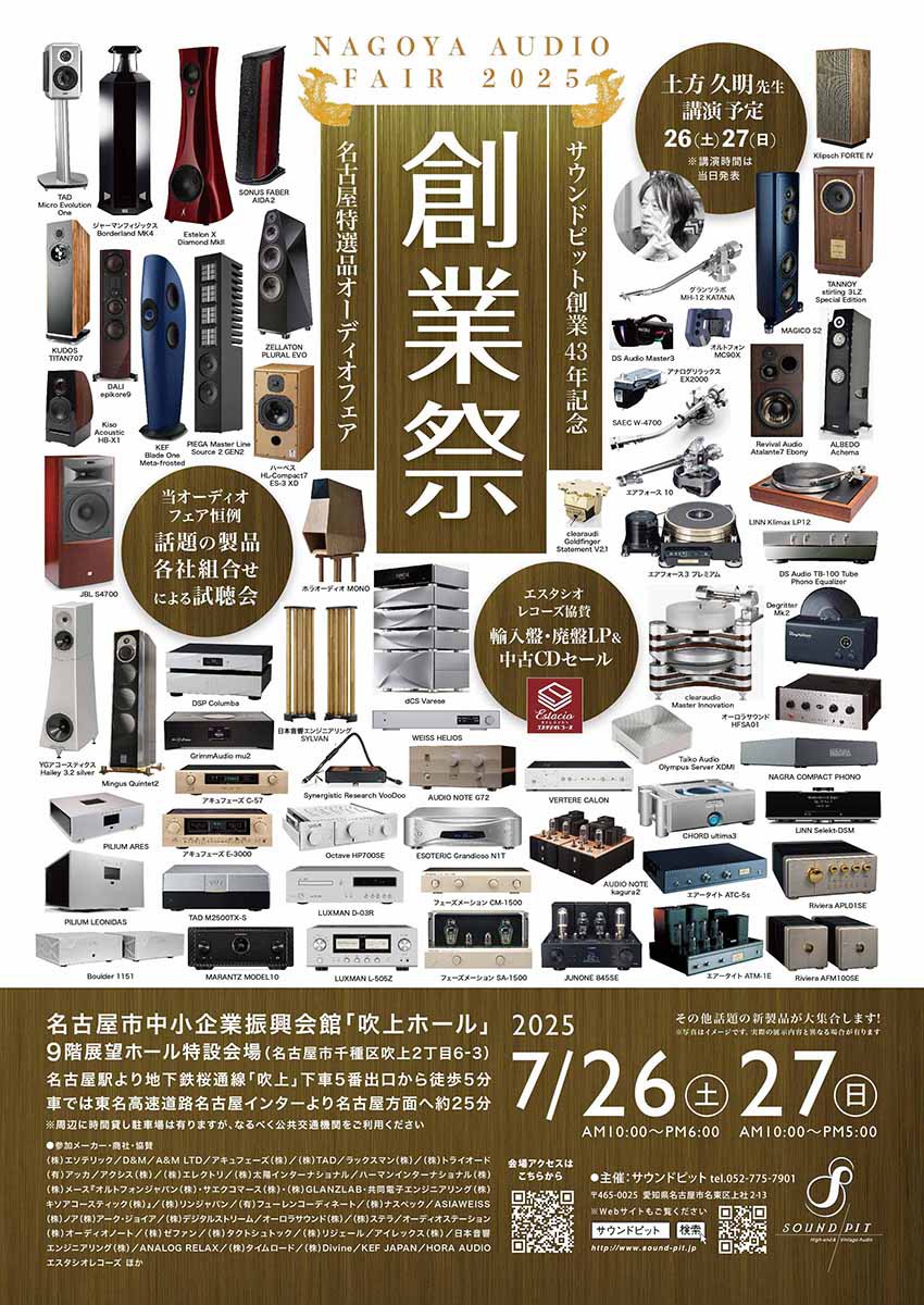 名古屋地区のオーディオ専門店 サウンドピットが主催する「創業祭」が、7月26日(土)と27日(日)に、愛知県名古屋市中小企業振興会館「吹上ホール」9F展望ホールにて開催される。入場無料、事前予約は不要。オーディオ評論家の土方久明氏が講演を予定する。