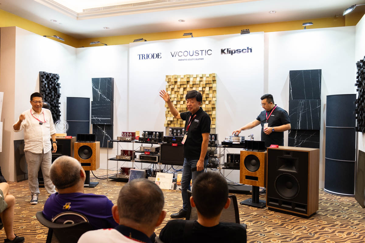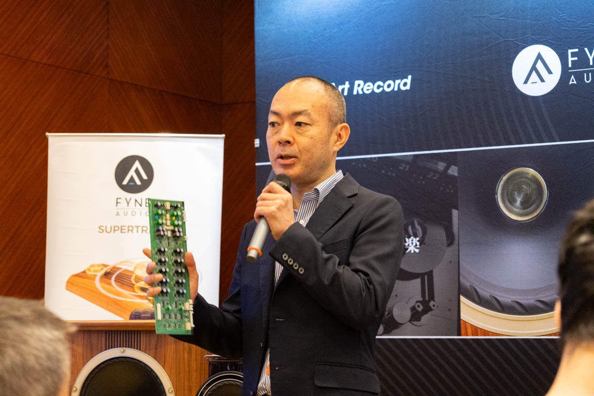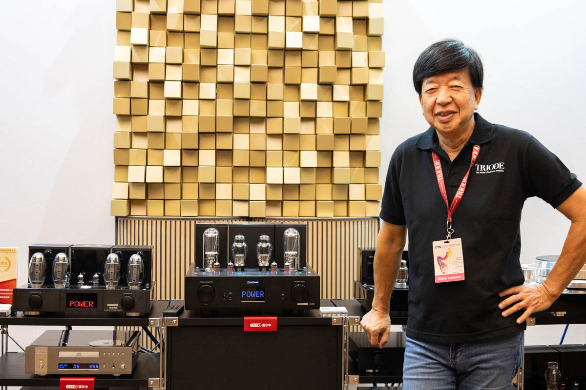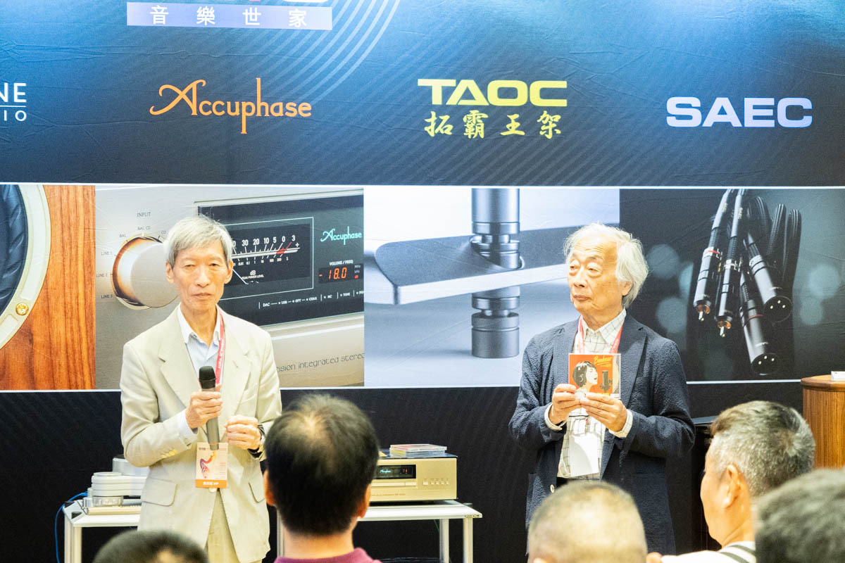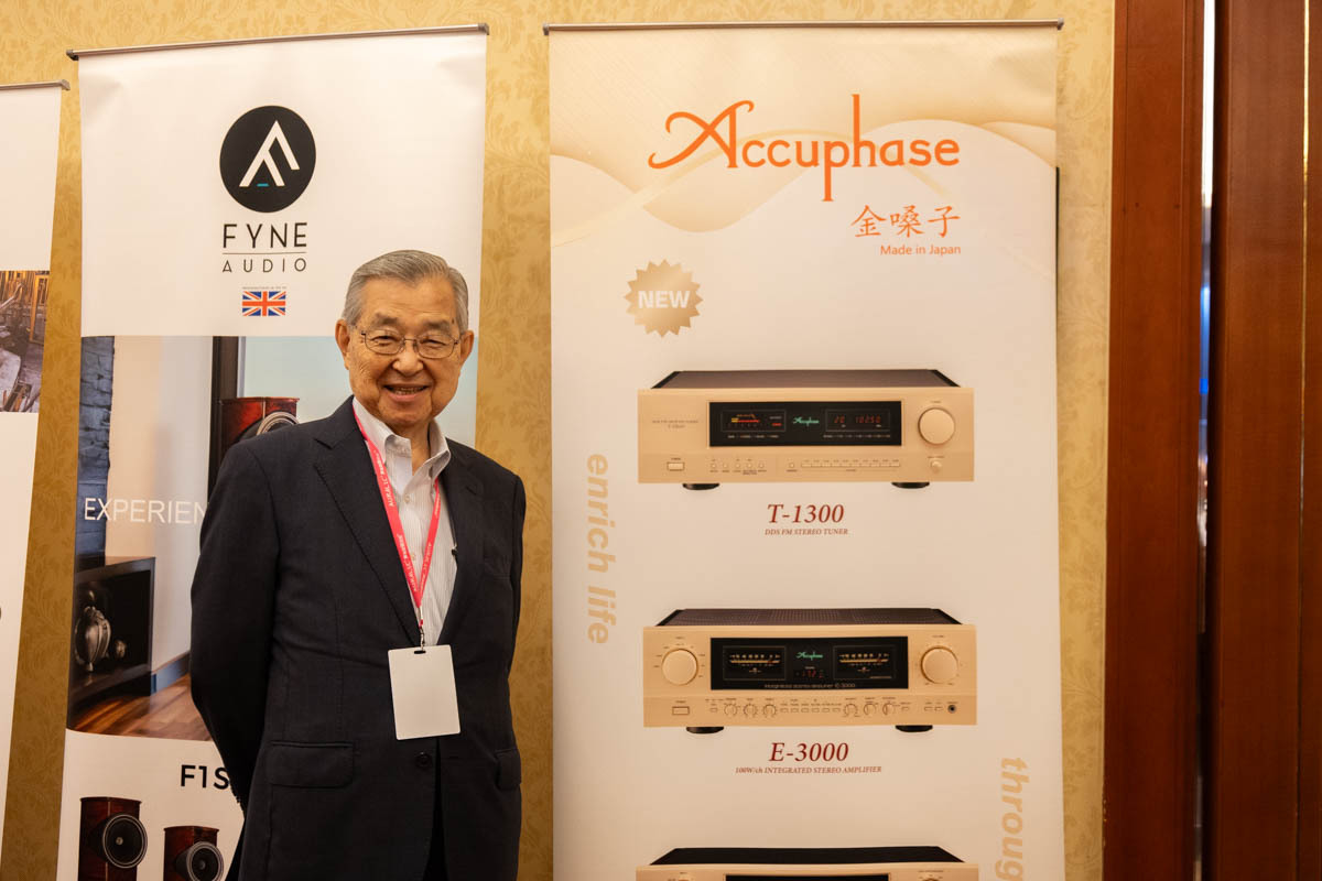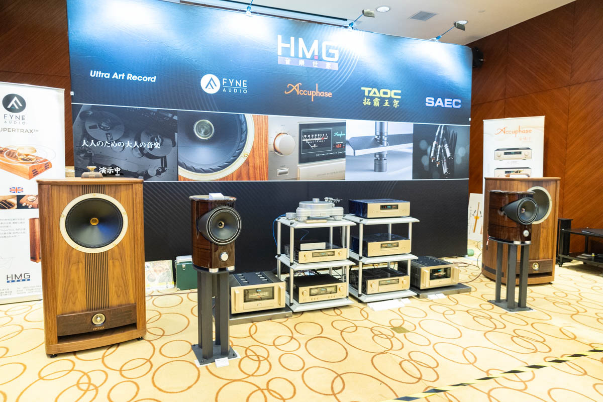 アキュフェーズ、サエク、タオックの3社は、日本メーカーの代理店を担当するHMG(House of Music Group)社のブースにて出展。HMG社は、他にもイギリスFYNE AUDIOの輸入販売を担当している。アキュフェーズのアジア進出に大きく貢献した許氏が社長を務めており、アキュフェーズの齋藤相談役とは50年を超える付き合いがあるという。