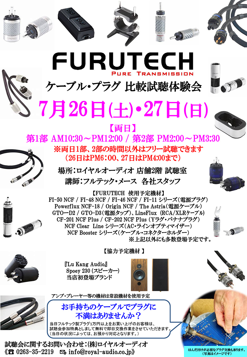 フルテックのケーブル&プラグ試聴会、ロイヤルオーディオにて7月26日、27日開催