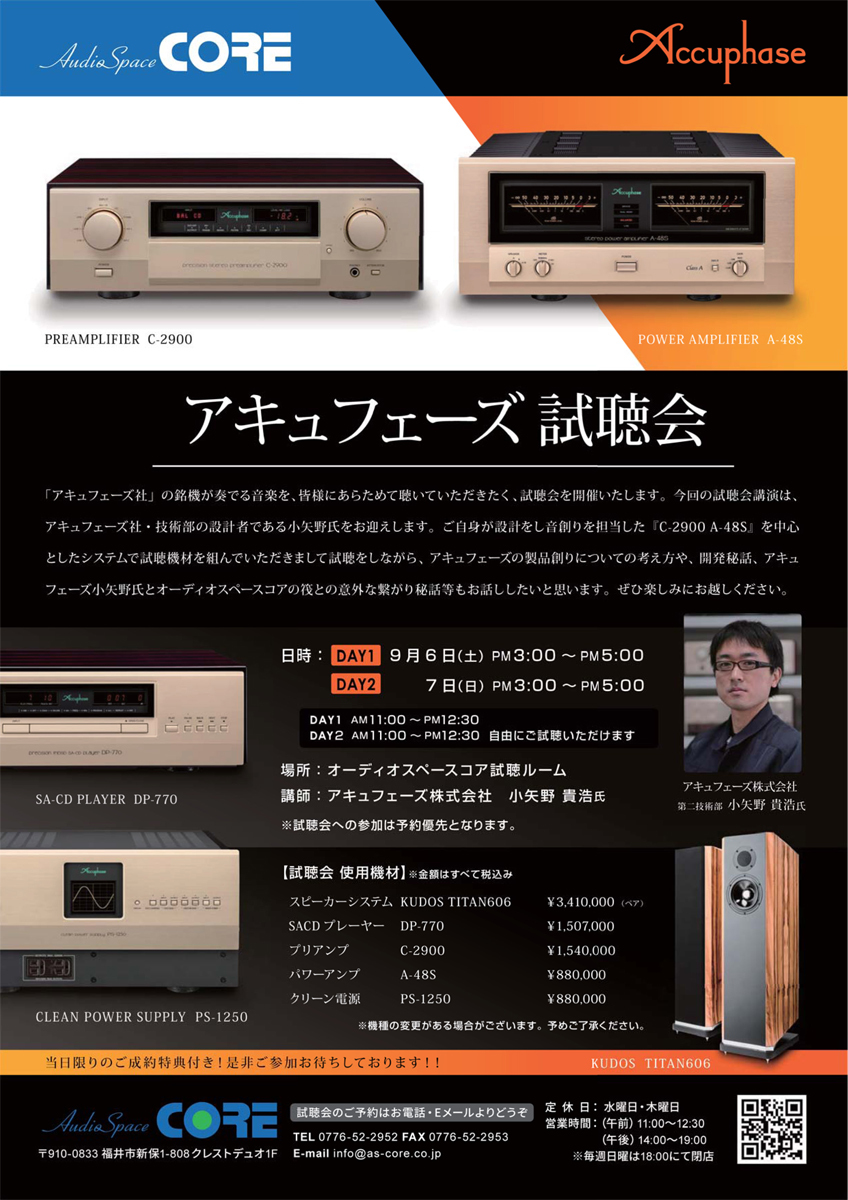 アキュフェーズの試聴会が、9月6日(土)と7日(日)の2日間、福井県のオーディオショップ、オーディオスペースコアにて開催される。