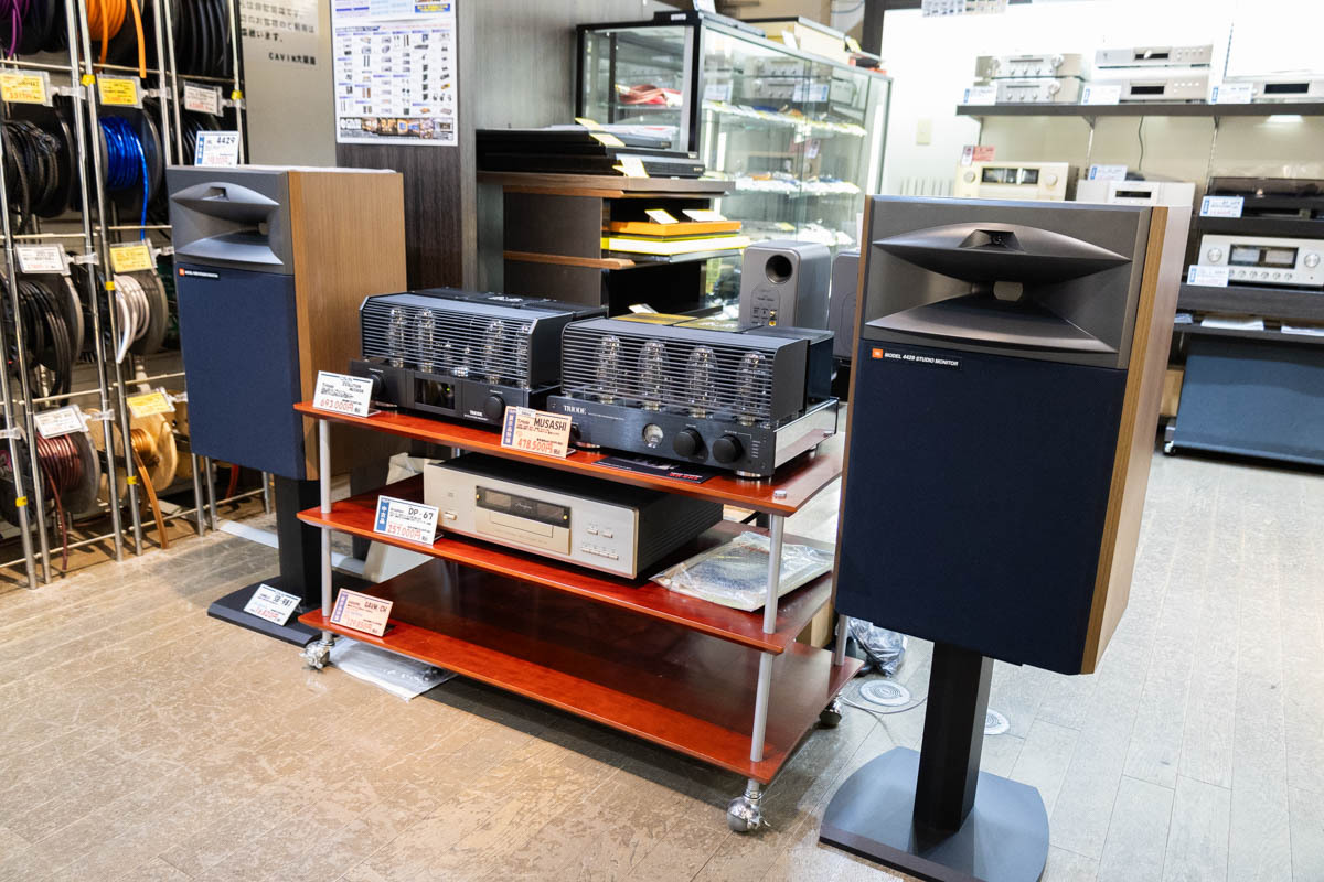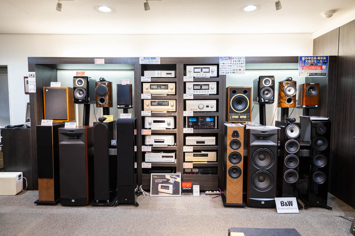 中古の製品も充実している。「うちはもう店を始めて長いですから(笑)、ほんとにいろんな中古製品が入ってきますよ」。ざっとみただけでもJBLの「4343」にタンノイ「Canterbury/GR」、Bowers & Wilkinsの800シリーズと歴代の銘機たちが並ぶ。もちろんショップ側できちんとメンテナンスして次のお客様の元にお届けする。中古製品との出会いはまさに一期一会。中古品情報はSNSでも積極的に発信されているのでこちらもぜひチェックしてほしい。