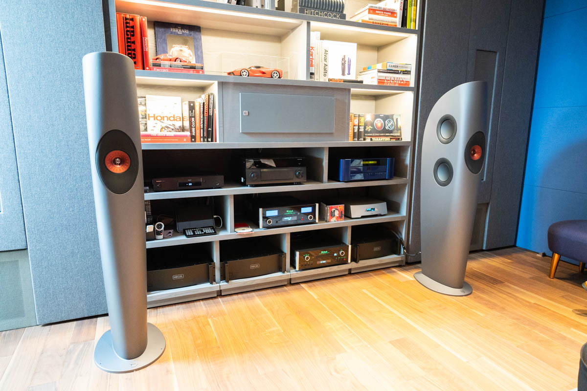 KEFの最上階試聴スペースにて、KEF「BLADE」をメインスピーカーとして試聴会を実施。CDプレーヤーはマッキントッシュの「CDS550」で、MQAフォーマットとの比較のためにメリディアンのCDプレーヤー「808」も用意。プリメインアンプは同じくマッキントッシュの「MA5200」を組み合わせている。