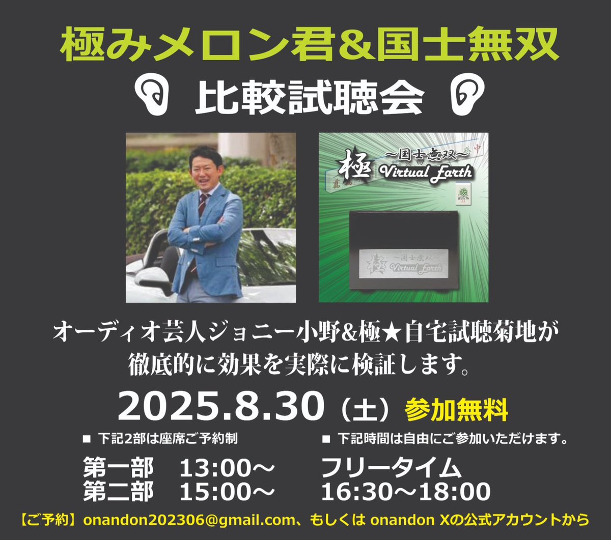 イベントは、オーディオ芸人・ジョニー小野氏と開発者である極☆自宅試聴の菊地氏によるトークセッション形式で進行。同製品の開発背景はもちろん、有り無しの比較試聴によってその効果を実際に確認できる。席数限定のため予約制となっており、下記メールアドレスにメールするか、もしくは「on and on」公式XへのDMにて受け付けている。