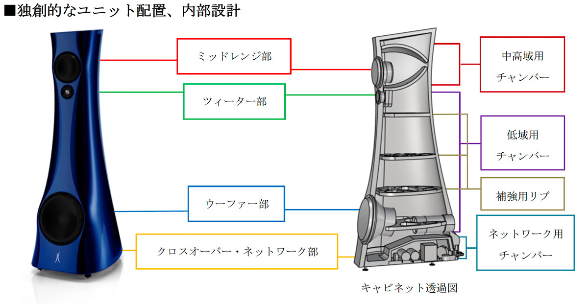 トゥイーターとミッドレンジはそれぞれ独立したチャンバー構造に収められており、 ウーファーからの物理的・音響的な干渉を受けることなく、 その能力を存分に発揮するとしている。