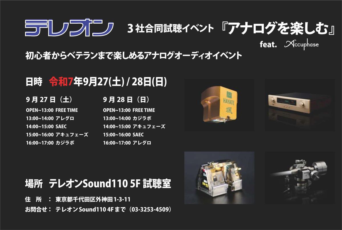 秋葉原のオーディオ専門店テレオンは、「3社合同試聴イベント アナログを楽しむ feat.Accuphase」を、2025年9月27日(土)・28日(日)の二日間にわたり、テレオンsound 110(第2店)5階試聴室にて開催する。