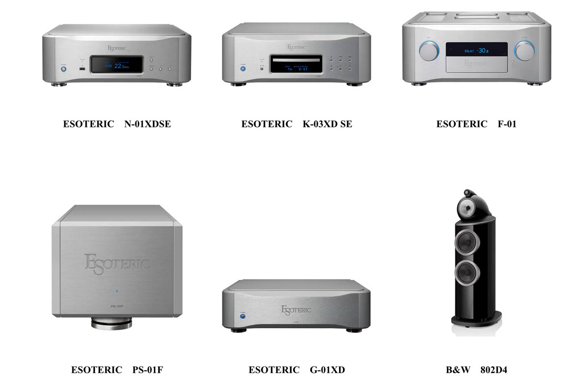 ネットワークプレーヤー「N-01XD SE」に、マスタークロックジェネレーター「G-01XD」を接続し、A級プリメインアンプ「F-01」を組み合わせたシステム。さらに、エソテリック独自の電流伝達 “ES-LINK Analog” のデモンストレーションや、専用外部強化電源ユニット「PS-01F」を加えた比較試聴も体験できる。スピーカーには、Bowers&Wilkinsの「802 D4」を使用予定だ。