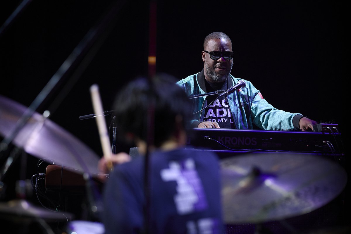 The Shun Ishiwaka Septetは、ステージ上左からキーボード、ギター、ギター、トランペット、サックス、ベース、そして石若のドラムと並んでいるが、それぞれの楽器の位置関係が明瞭にわかることで、彼らの息遣いや掛け合いの妙などが非常によく見えてくる。今回ステージから見て左側の座席で鑑賞していたが、“一味違う”リアリティの密度感をたっぷり味わうことができた。