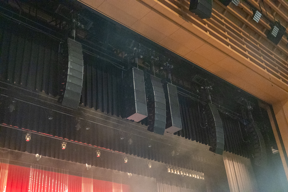 写真では少し分かりにくいが、ステージ上方に、上から吊り下がっている縦長のスピーカーが、今回のd&b Soundscapeのために導入されたスピーカーとなる。メインスピーカーが10基×5ラインの50基、それに左右にサブウーファーを8基。これがホール全体に音を届けるラインアレイスピーカーとなる。さらに、1Fの正面エリアに音を届けるために、ステージ上に7基のスピーカーを配置。d&b Soundscapeとしても、過去最大規模のシステム構築となったそうだ。