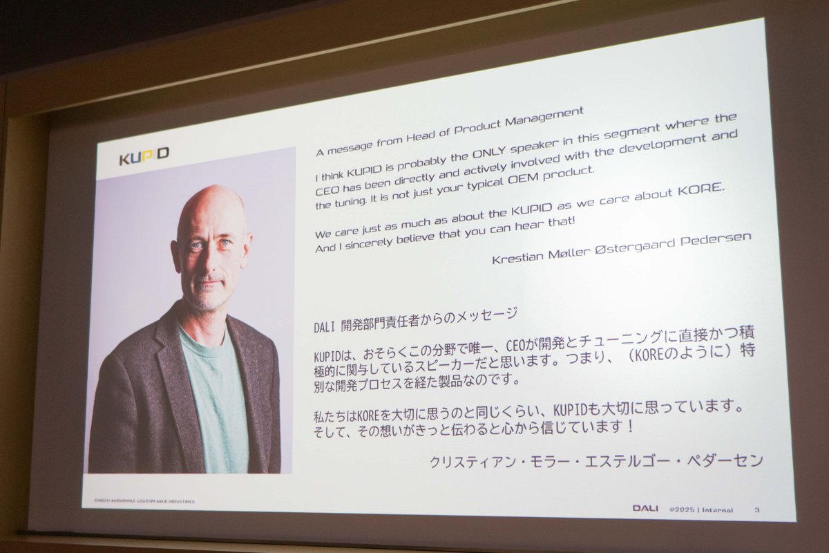 DALIの開発部門責任者であるクリスティアン・モラー・エステルゴー・ペダーセン氏は、「KUPIDは、おそらくこの分野で唯一、CEOが開発とチューニングに直接かつ積極的に関与しているスピーカーだと思います。つまり、KOREのように特別な開発プロセスを経た製品なのです」と、KUPIDへの想いを語った。
