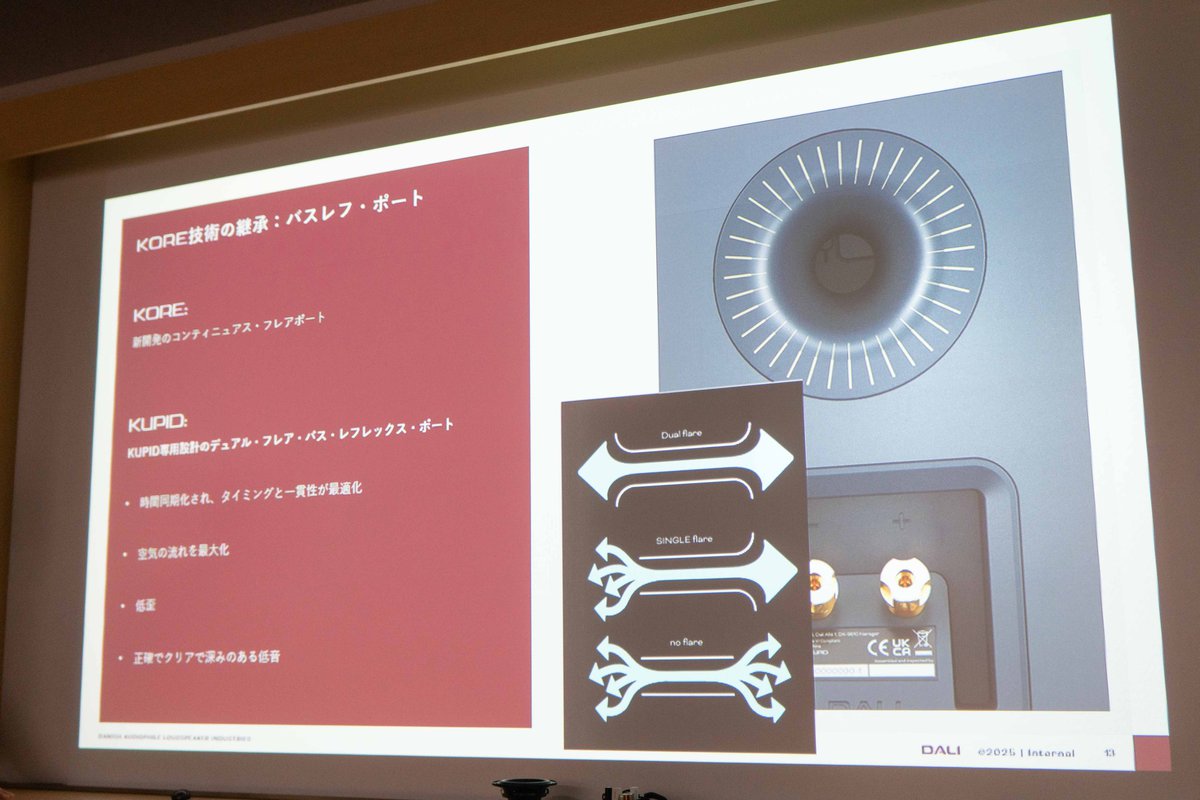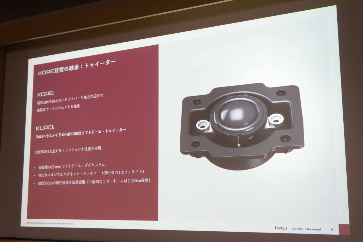 そしてKUPIDの本質的な部分として、ソフトドームやウッドファイバーコーンなどの有機機材を使用するというDALIのポリシーを守りながら、独自技術の高速ドライバーによって有機素材の欠点を補完する “KOREテクノロジー” 、温かく聴き疲れしない音質と微細で広大な空間表現を兼備した “KOREサウンド” といった、フラグシップモデルの思想が受け継がれていると明かした。