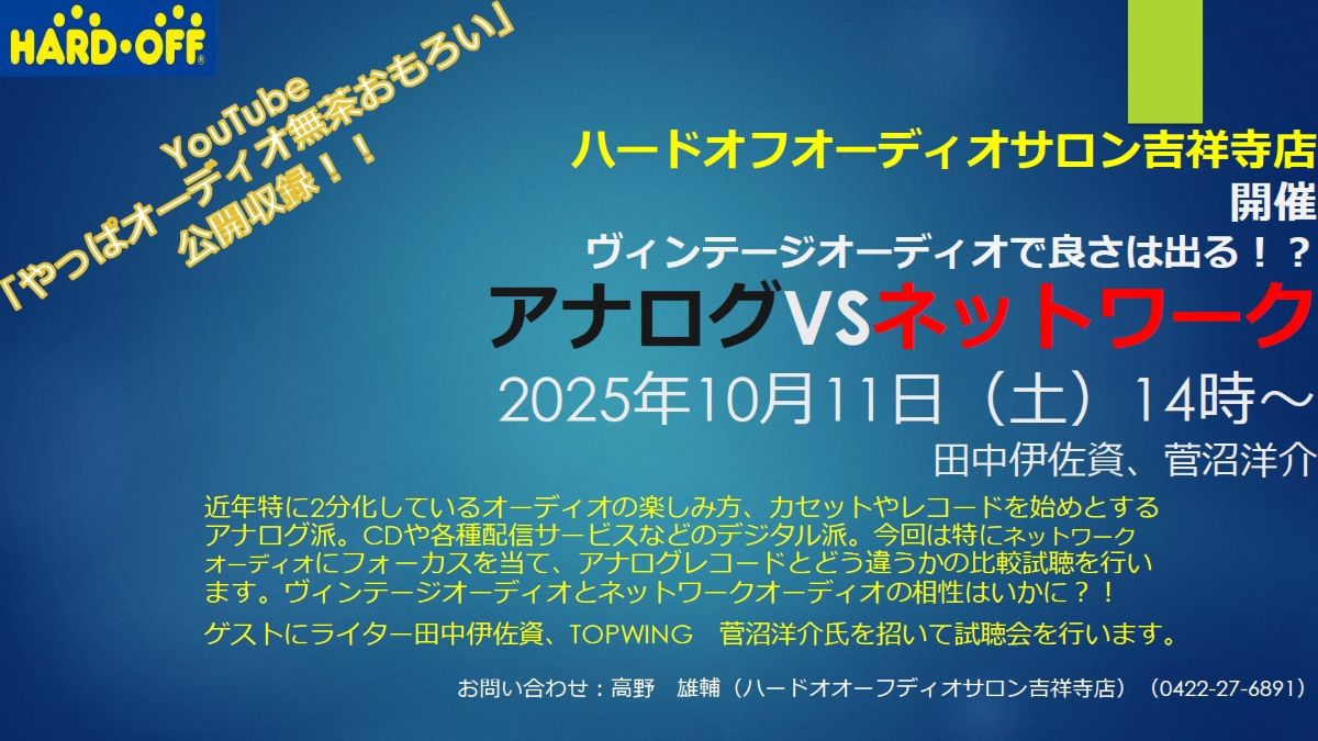 マニア垂涎のハイレベルにリペア(整備)されたリユース商品が揃うオーディオ専門店「ハードオフオーディオサロン吉祥寺店」は、2025年10月11日(土)14時より、「ヴィンテージオーディオで良さは出る!?アナログVSネットワーク」と題したイベントを開催する。