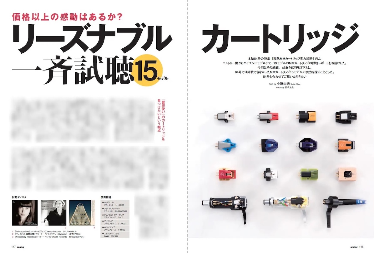 第2特集は、「リーズナブルカートリッジ 一斉試聴 15モデル」です。オーディオの高価格化が進む今、リーズナブルで良いものがユーザーの間では求められています。今回採り上げたのは、5万円以下のカートリッジたち。果たして、価格以上の感動はあるのでしょうか? 本誌84号で特集したMMカートリッジ特集の続編として、小原由夫氏が15モデルのテストを敢行しました。