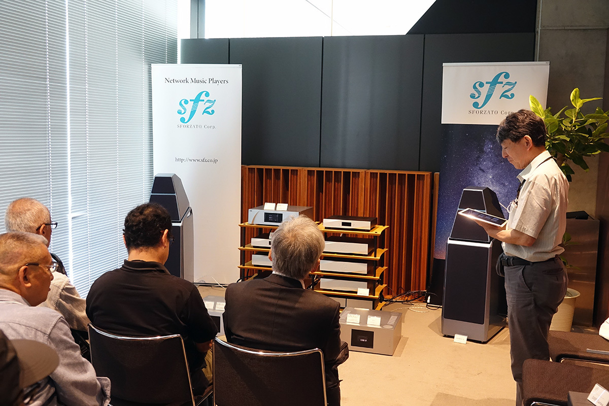 リジェールは、スフォルツァートの各製品を展示。ネットワークプレーヤー「DSP-Columba」やマスタークロック「PMC-Cetus」などのデモを行っている。