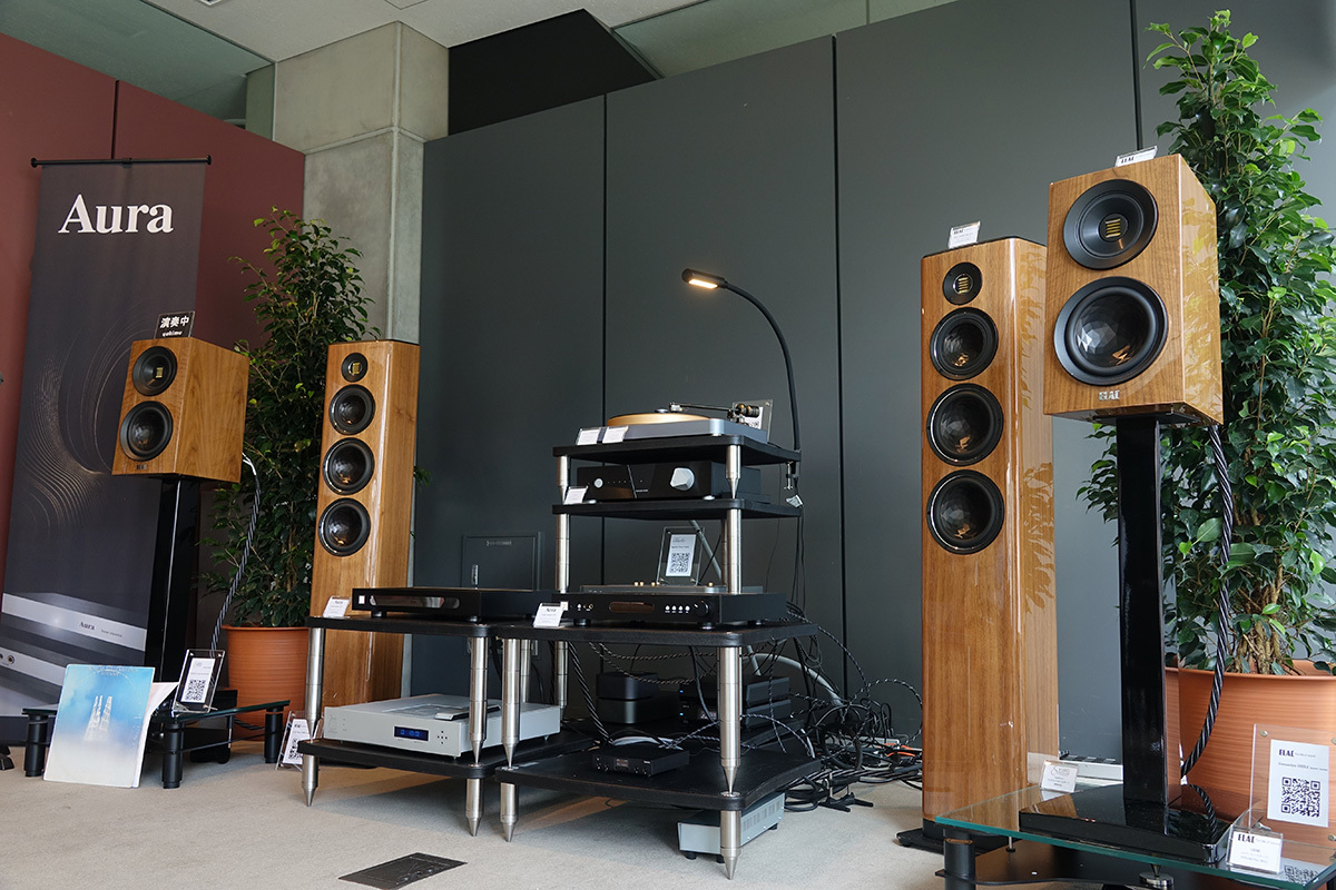 ユキムは、パワーアンプ「LCP1」などAuraの新シリーズ「linear classics」を中心に、ELAC、AIRPULSEなど、同社が取り扱う様々なブランドの製品を展示している。