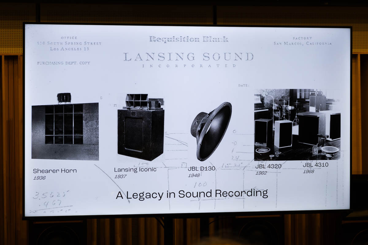 発表会では、創業者のジェームス・B・ランシング氏が映画スタジオMGMのスピーカーを製作したことなど、JBLのスタジオモニター誕生の背景を解説。EMIなど世界各国のスタジオのモニターとして活用されてきた「4320」、その後家庭用にも活用される「4310」など歴史的プロダクトを紹介。