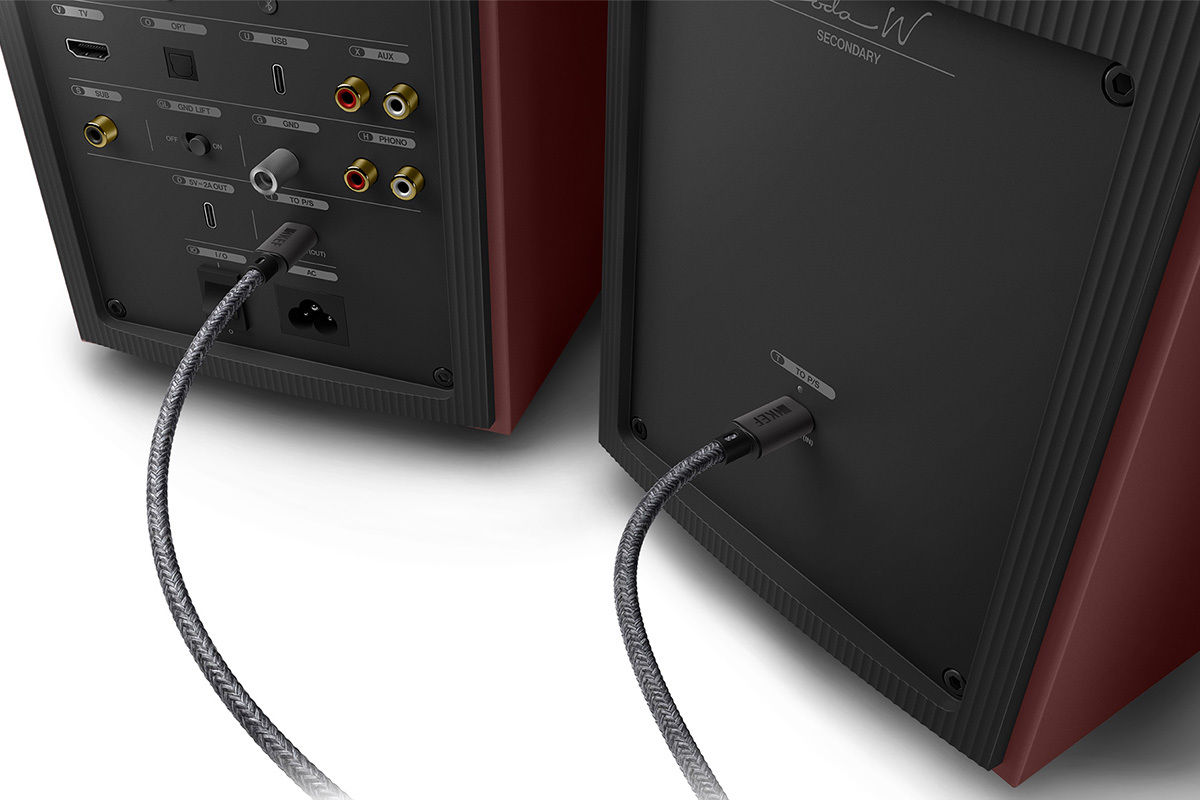 なお、プライマリースピーカー(R)とセカンダリースピーカー(L)は音響的に同一の構造設計を採用している。スピーカー間にはUSB Type-Cケーブルによる有線接続が必要で、最大96kHz/24bitの伝送に対応する。本体にはUSB Type-Cケーブル(3m)が付属する。