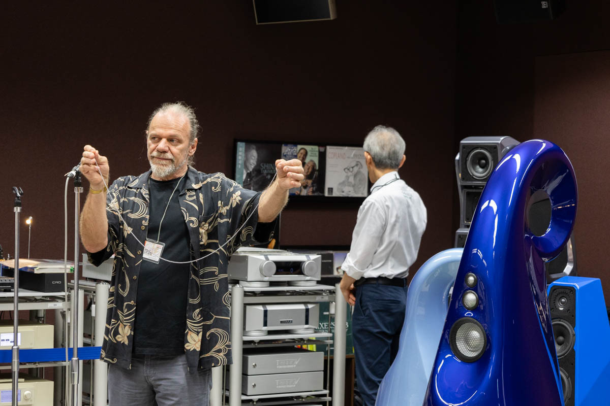 ステラ・ゼファンのブースでは、話題のハイエンド製品が一挙に登場。まずは世界初披露となったVIVID AUDIOの「Giya Cu」シリーズ。会場ではトップラインの「Giya G1 Cu Spirit」と「Giya G3 Cu」の2モデルを再生。開発担当のローレンス・ディッキー氏は、チューブやチェーンなど小道具を交えたプレゼンテーションで、Giyaシリーズに込めた技術を詳しく解説した。