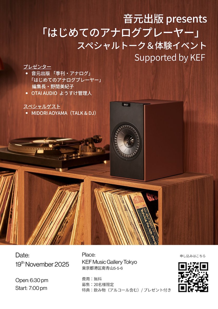 音元出版・季刊・アナログ編集部が作った無料の小冊子『はじめてのアナログプレーヤー vol.2』(10月28日より配布開始)の刊行を記念して、 11月19日(水)に音元出版×KEF JAPAN×OTAIAUDIOのコラボレーションイベントを開催いたします。会場は東京・表参道のKEF Music Galleryです。