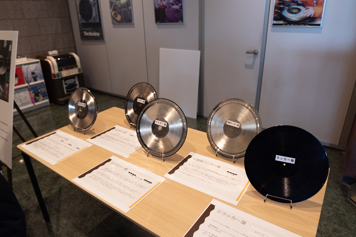 エントランスではカッティング工程からプレスに至るまでの課程をパネルで紹介されるほか、ラッカー盤やマスター盤、マザー盤、スタンパーの現物も展示。わかりやすい解説と共に、実物を見ながら特にスタンパーの薄さに多くの方は驚かれていた。