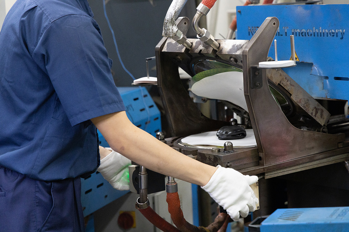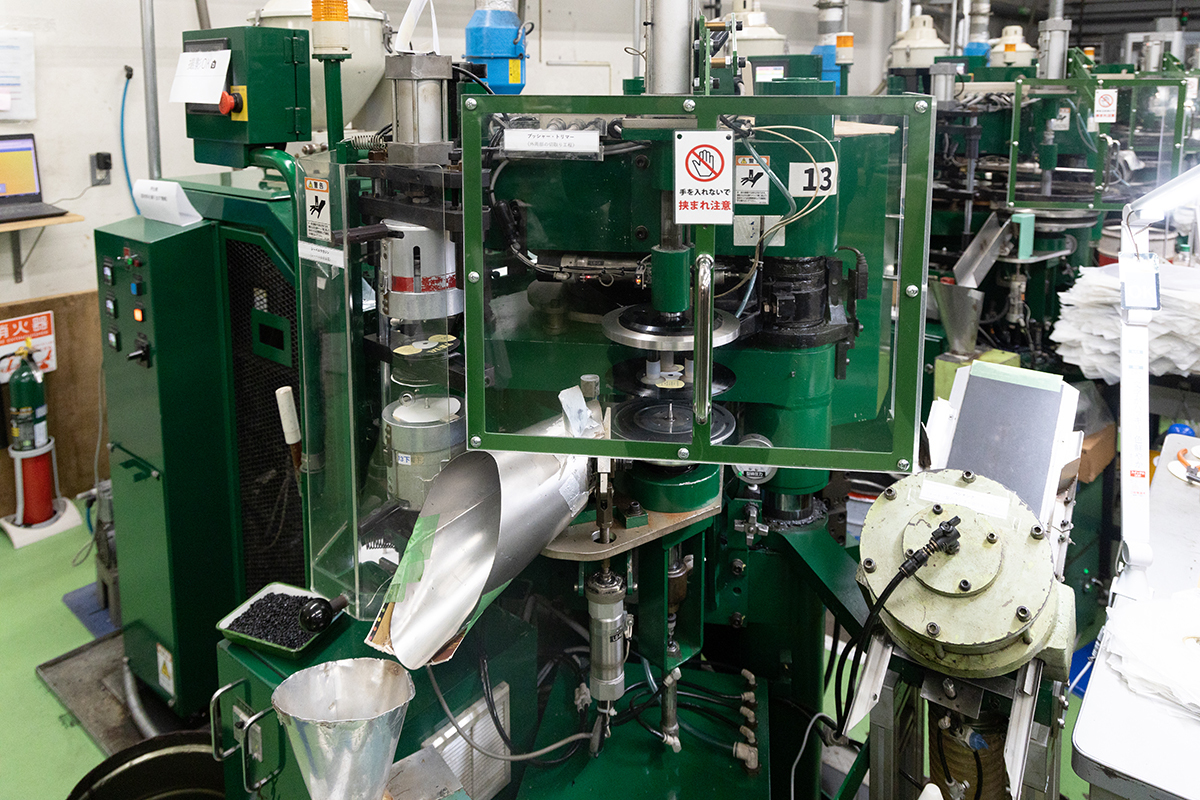 東洋化成では自動型と手動型を合わせて約15台のプレス機を用いて生産していること。そして自動型の中には、7インチ盤用と12インチ盤用があり、どちらも塩化ビニールを約150度で溶かしながら100トンの圧力でレコードの形にプレスする。自動といっても、その日の気温や湿度によってレコードの形が微妙に変わるそうで、細かな職人技が求められるという。