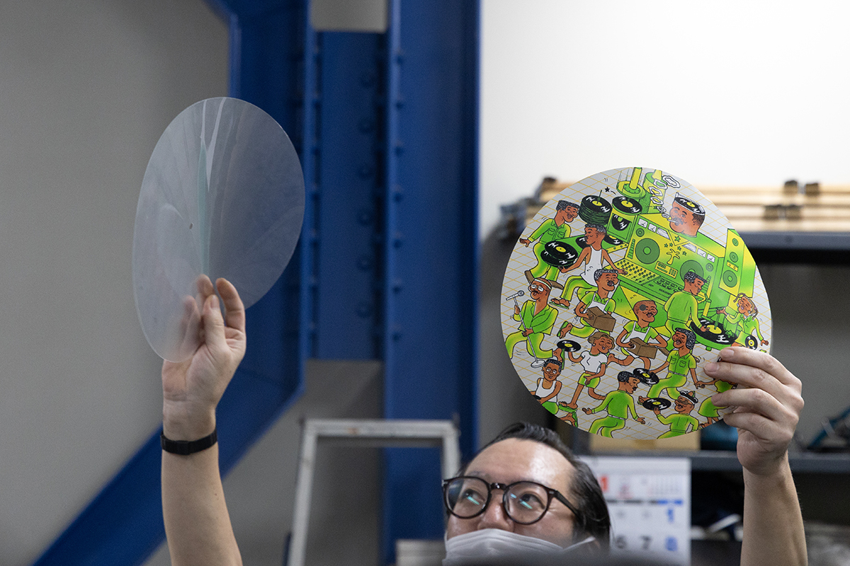 手動機では、ピクチャーレーベルの盤が作られていた。こちらは透明のシートの下に印刷した紙を置き、塩化ビニールで密着させるという5層構造。音溝は透明のシートに刻まれる。プレス機に人がセットするという工程が必要なことから、こちらの生産枚数は1日200枚程度。