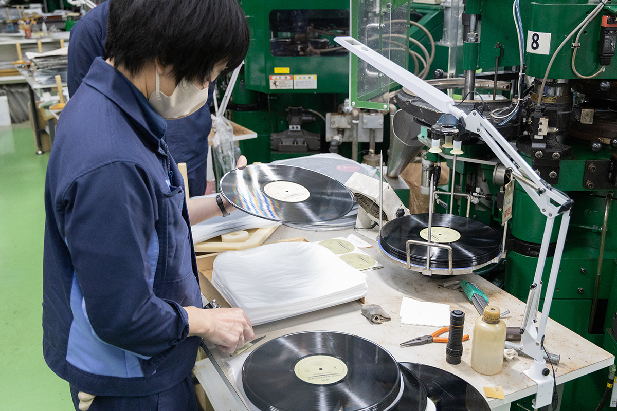 どちらも出来上がったレコードは1枚1枚検盤した後、ビニール内袋に挿入。その後、ジャケットに納められる。