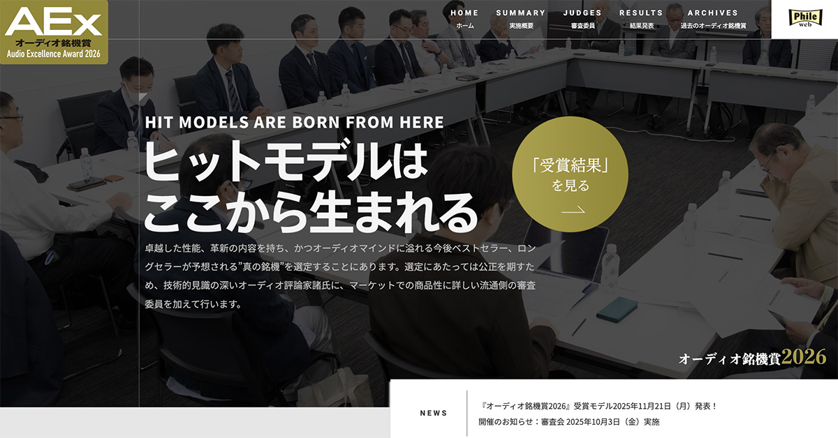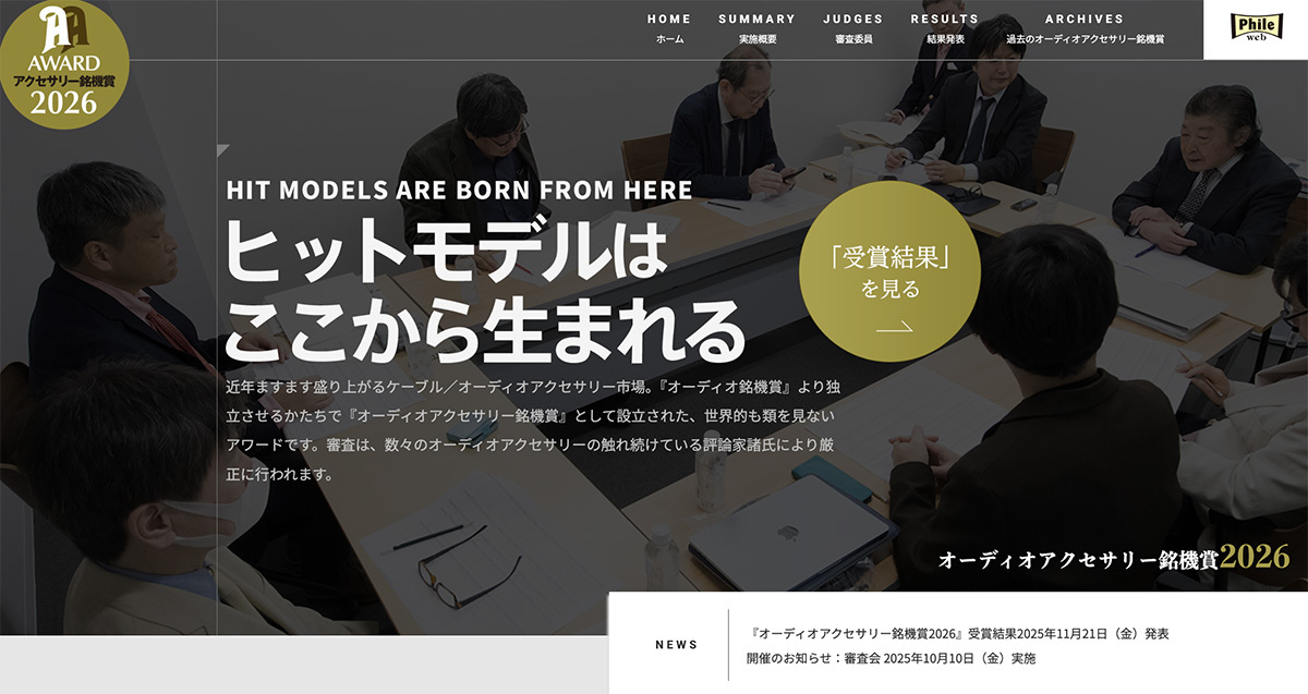 オーディオ文化の向上とマーケットの活性化を目的として創設された「オーディオ銘機賞2026」「オーディオアクセサリー銘機賞2026」。それらの全受賞結果を発表する特設サイトが、本日11月21日にオープンした。