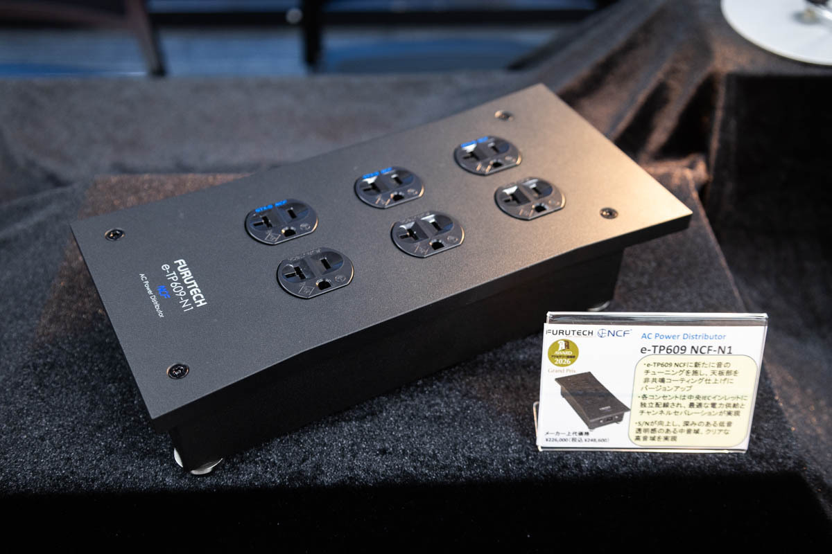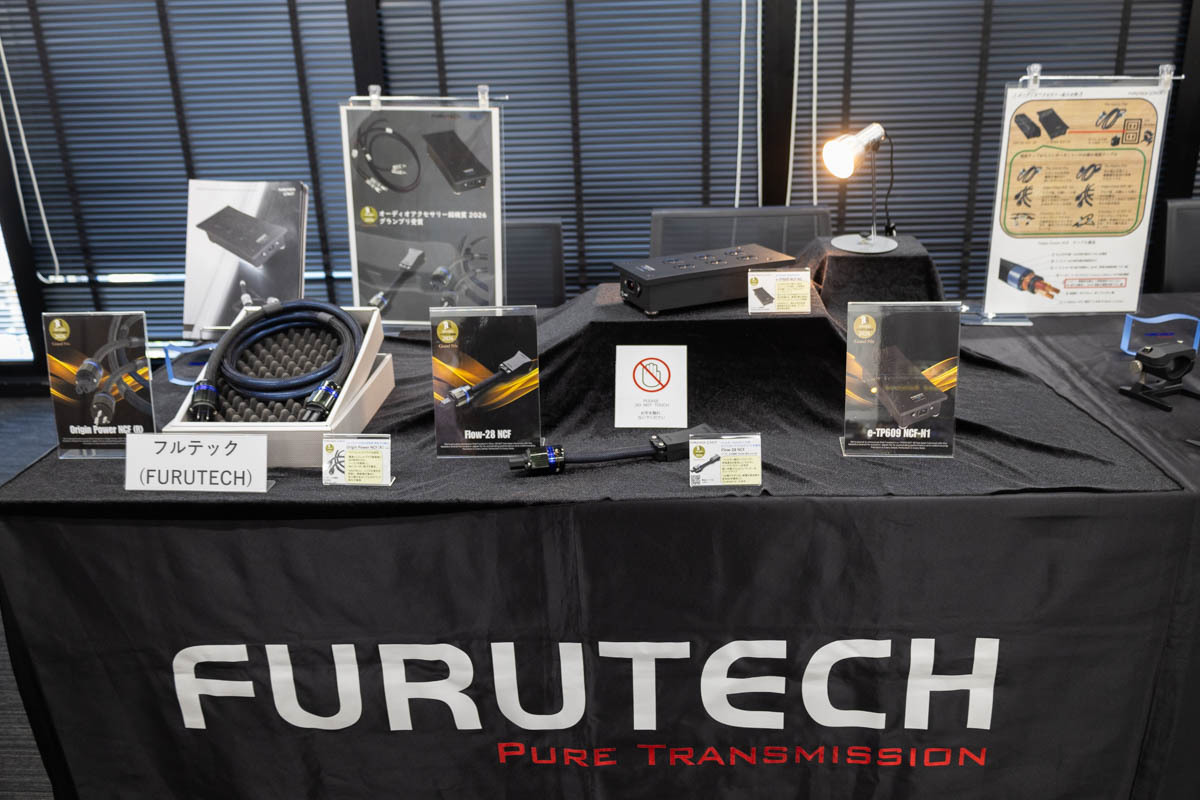 フルテックは、PDNとの合同ブースのほか、こちらのRoom1にもテーブル出展。電源タップ「e-TP609 NCF-N1」のほか、自作ケーブルに活用できるコネクタ類、ケーブルまで幅広いアイテムを展示。「過去に発売した製品を、NCFを投入することでさらなるグレードアップを図っていきます」と今後の製品ラインナップについても意欲を見せてくれた。
