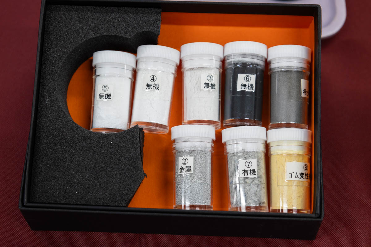 ブースでは、インシュレーターの違いをゼンハイザーのヘッドホンで体験できるシステムも用意。ヘッドホンアンプの下に各種インシュレーターを装備することで、どう音が変わるか体験できるようになっている。また特別に仮想アースの素材の“元”となる金属粉なども公開、これらをどのくらいの配合で混ぜ合わせるかによって音質のチューニングができるそうだ。